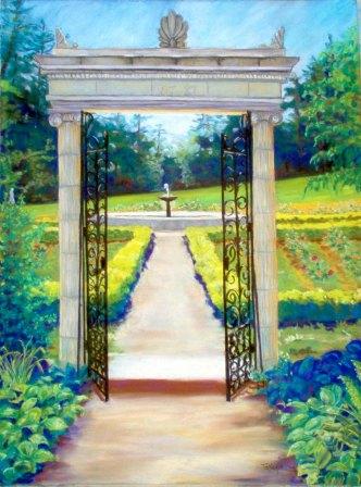 Here is another piece inspired by the beautiful Yaddo grounds. This was done using reference photos from a recent visit. The path leads into the garden beyond the iron gates, which are framed by beautifully weathered marble columns and arch. If you look closely, you’ll see the initials of the Yaddo benefactors Spencer and Katrina Trask engraved on one of the marble blocks.