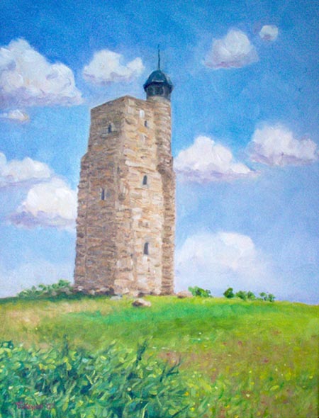 I did this painting using reference photos from a trip we made to the beautiful Mohonk Mountain House last summer. The tower sits at the top of a mountain, which is accessible by hiking one of the many scenic nature trails. You can climb all the way to the top of the tower, where the views are just spectacular.