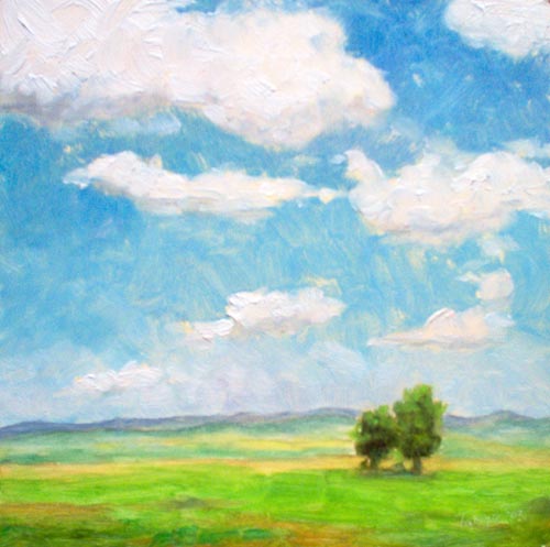 This painting was created from memory and a little imagination. Here, I’m trying something new – toning my canvas/panel with a very thin mix of yellow ochre and burnt sienna. This creates a really interesting effect that I really like.