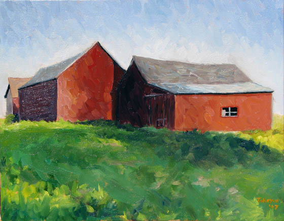 Here’s a painting of a couple of old barns near home. I love the way they seem to be leaning on each other in the late afternoon light.